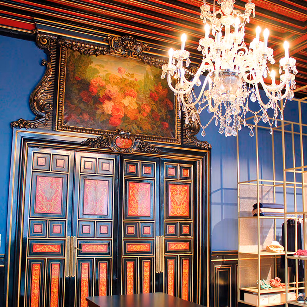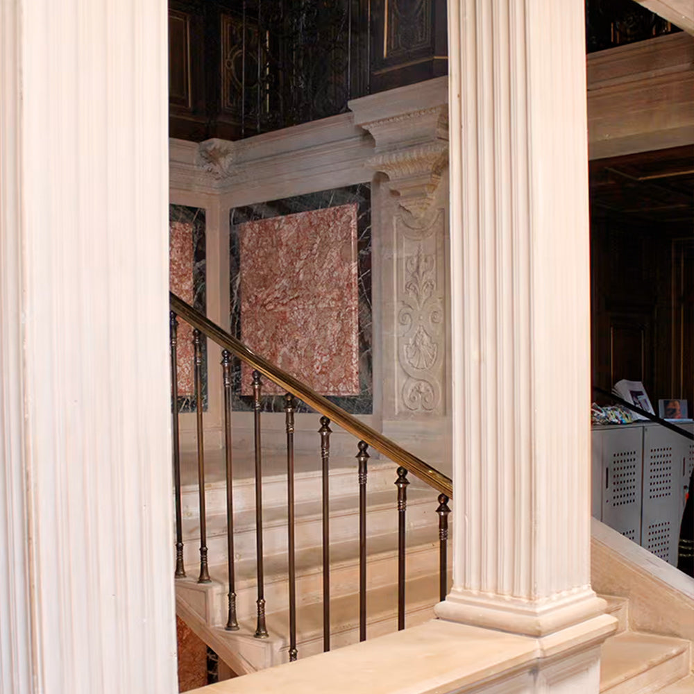 Les détails des gravures, les surprenantes frises qui imitent l’art toscan chères au Quattrocento, nous emmènent alors vers le showroom de notre Maison. Ici des tables larges dans des tons ambre et noirs, qui accompagnent les dorures, semblent rappeler que notre Maison s’attache à la commensalité ; commensalité des esprits et des projets, des petites-mains aux designers.