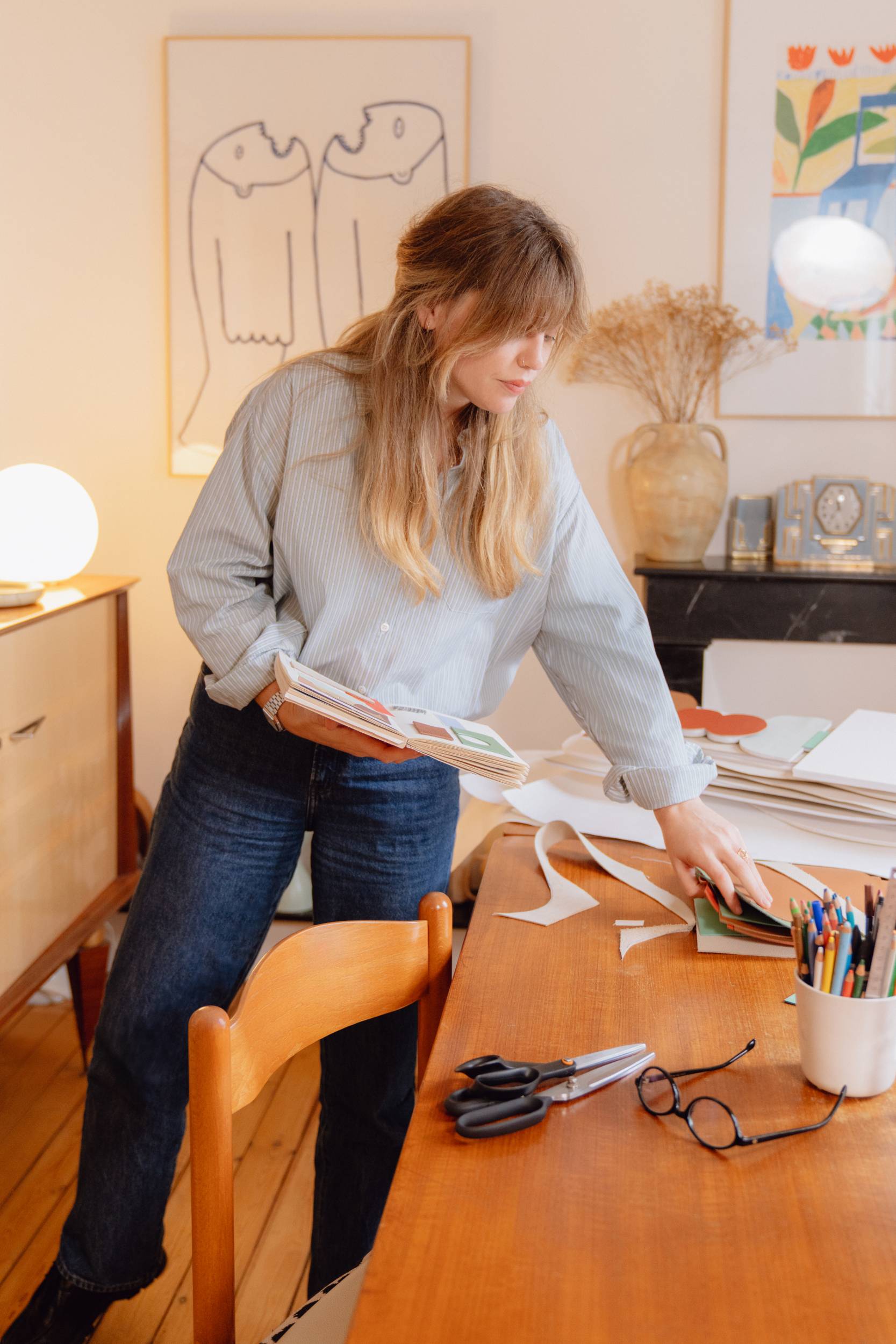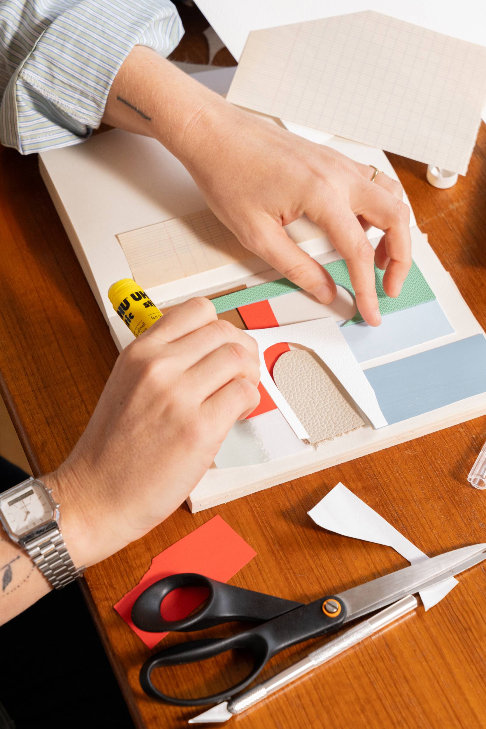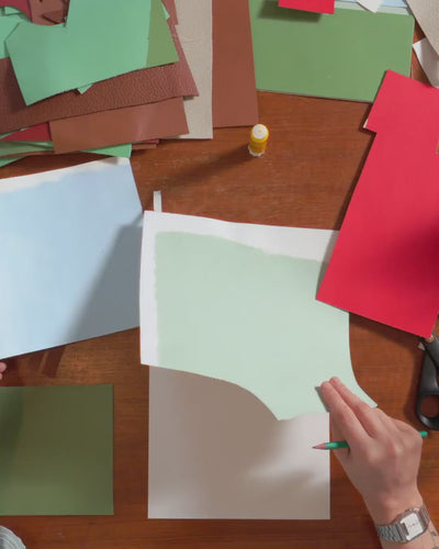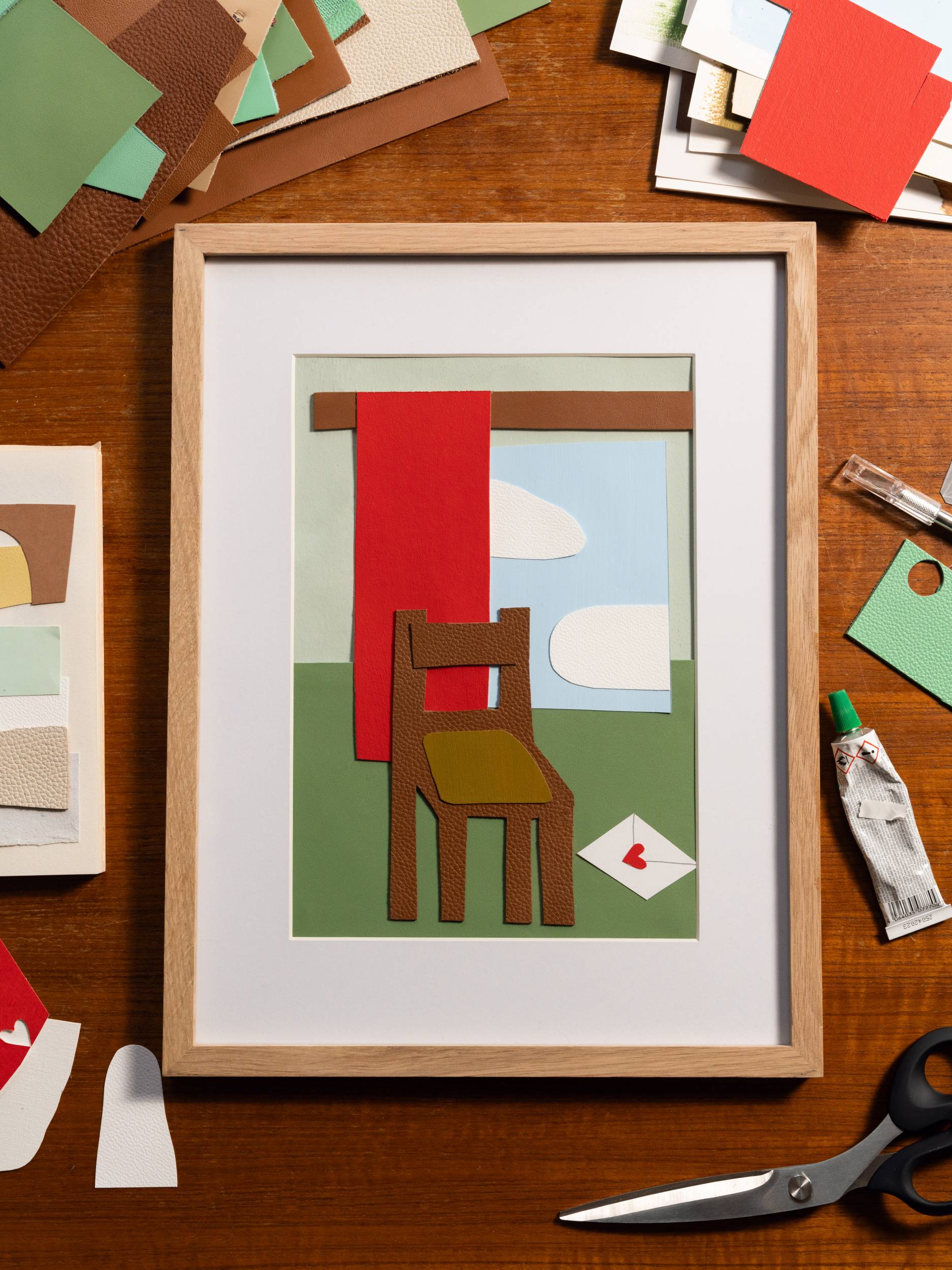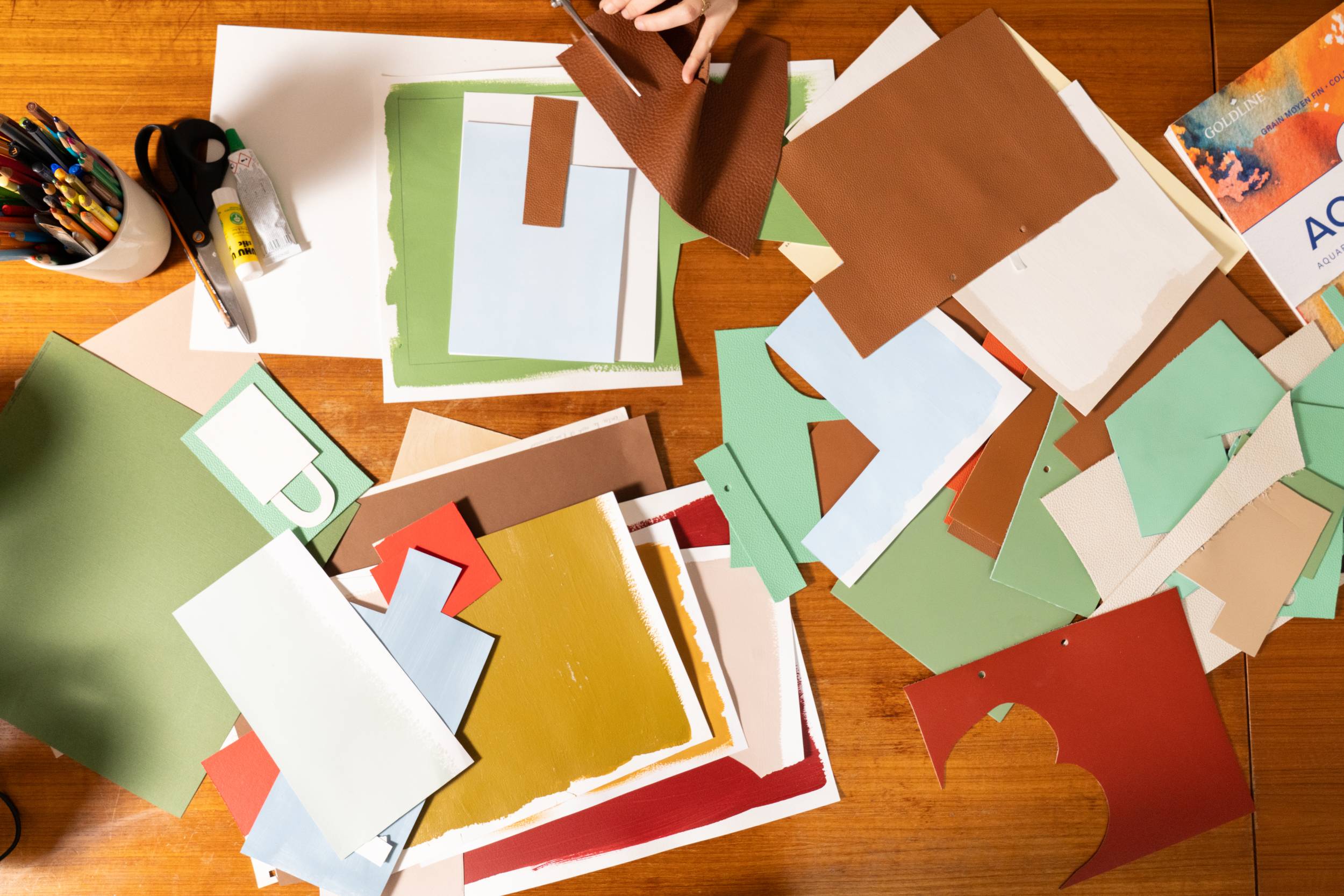 When it comes to creativity, everyday life is a remarkable starting point. While we craft leather goods, Nantes-based visual artist Amélie Dubois prefers to imagine visual poetry. Through her collages, the founder of Maison Moche delights in transforming the “little nothings” of daily life into evocative images. Habits, objects, gestures, and memories become the very essence of her work. We invited her to swap, for the duration of a project, her medium of choice—paper—for colorful leather offcuts, to create artworks for our shop windows. In her studio, we asked her a few questions about this collaboration and this new way of bringing leather into dialogue with everyday life.