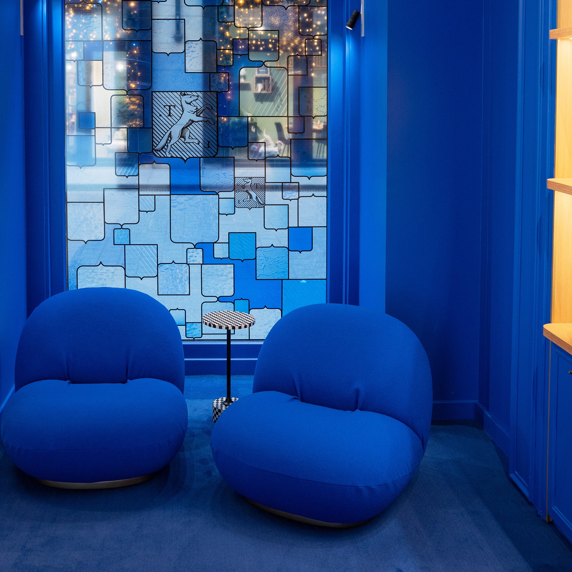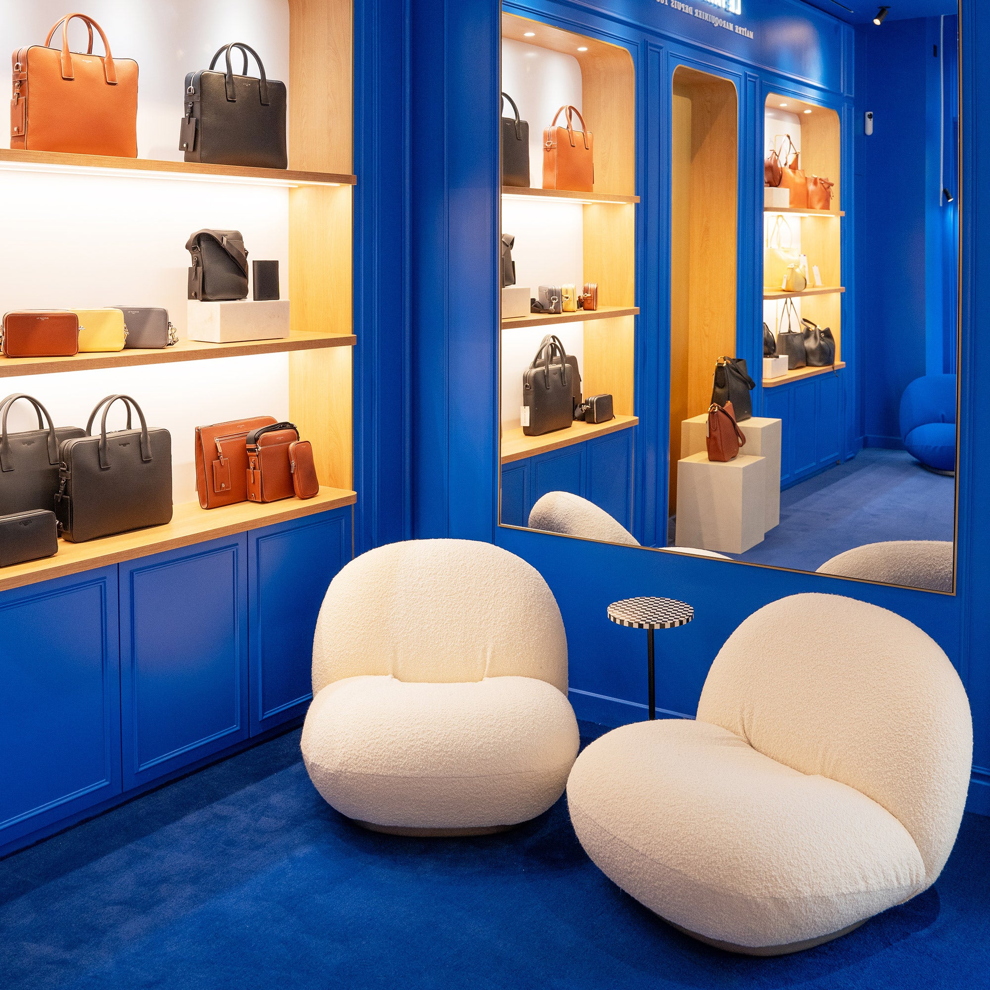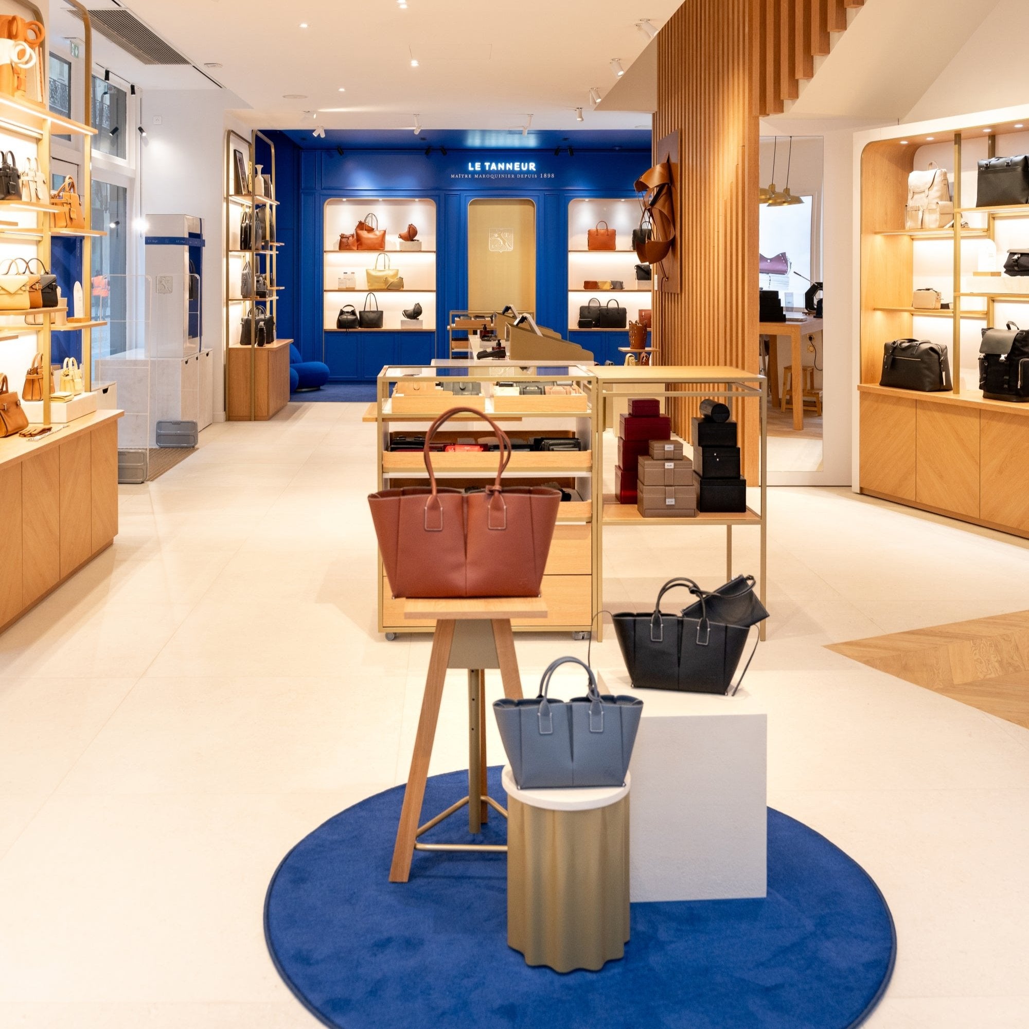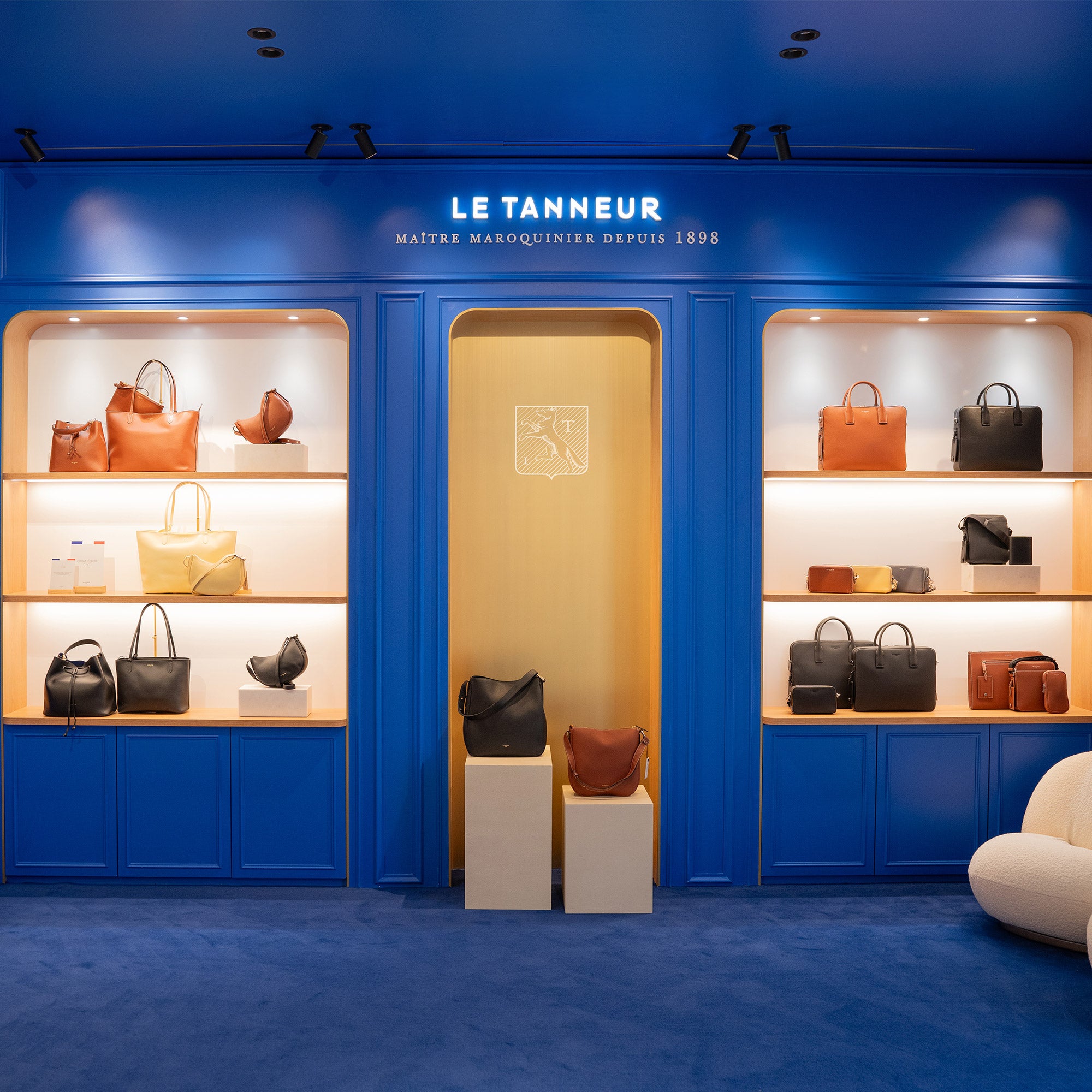 Un espacio atrevido donde paredes, suelos y techos están completamente revestidos del azul icónico de Le Tanneur. Esta "Blue Box" se ha diseñado para sumergir a los visitantes en un entorno monocromático que refleja la identidad visual de La Maison a través de una vidriera hecha a medida.